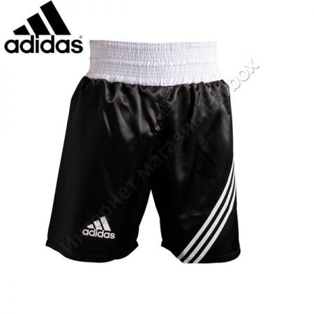 "Multi" боксерские шорты B G/S Черная атласная ткань, 180 г/м.кв. с золотыми полосами по бокам. Резинка шириной 10 см по талии. Логотип adidas вышит непосредственно на резинке