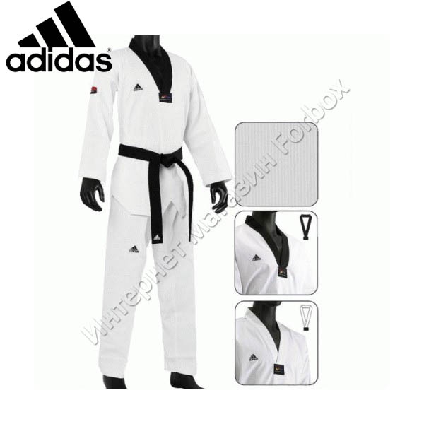 Добок серии ELITE! Цвет белый. 55% хлопок, 45% полиэстер. Красно-черная отделка ворота 100-150см рост .Черная отделка ворота от 160см и выше. Страна-производитель Южная Корея. Аккредитовано WTF (World Taekwondo Federation) Пояс в комплект не входит.
