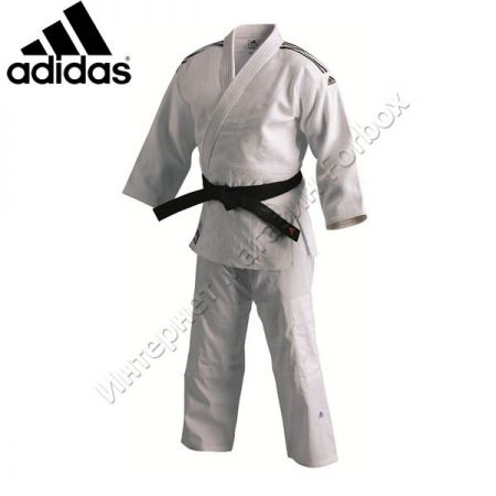 Кимоно adidas для занятий Дзюдо, серии J350 (соответствует Junior) с полосами, цвет белый. Ткань: хлопок. Плотность ткани: 360г/м2 Кимоно для новичков. Брюки на резинке. Пояс в комплект не входит.
