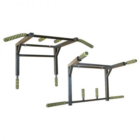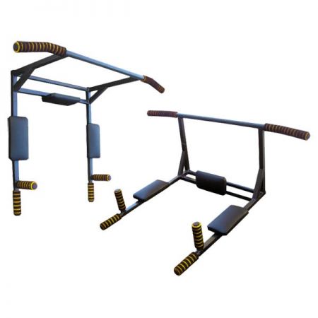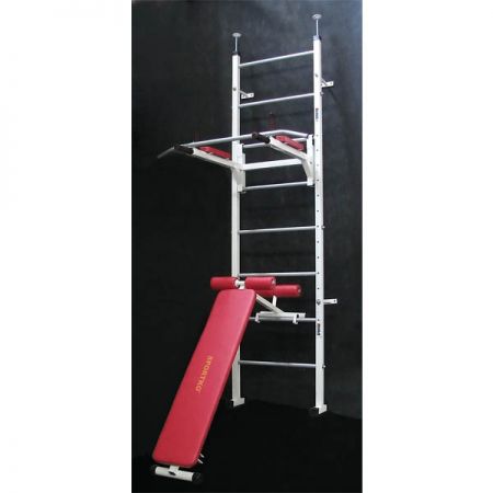 Турник и брусья можно переставлять на разный уровень высоты. В спорткомплексе имеется потолочное и пристенное крепление, ростовка, а также можно установить детское навесное (деревянная лестница, канат, кольца). Лавочкой для преса можно пользоваться независимо от спорткомплекса.